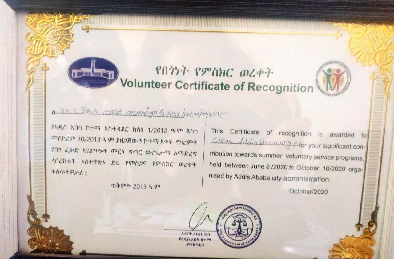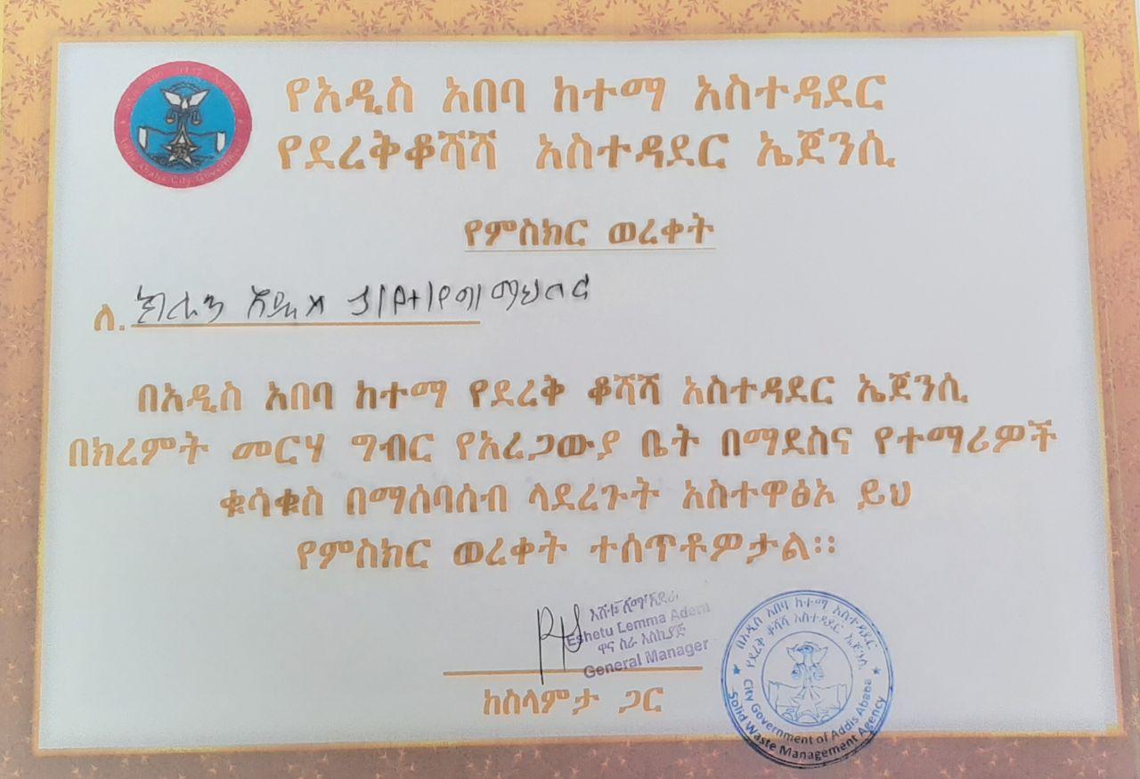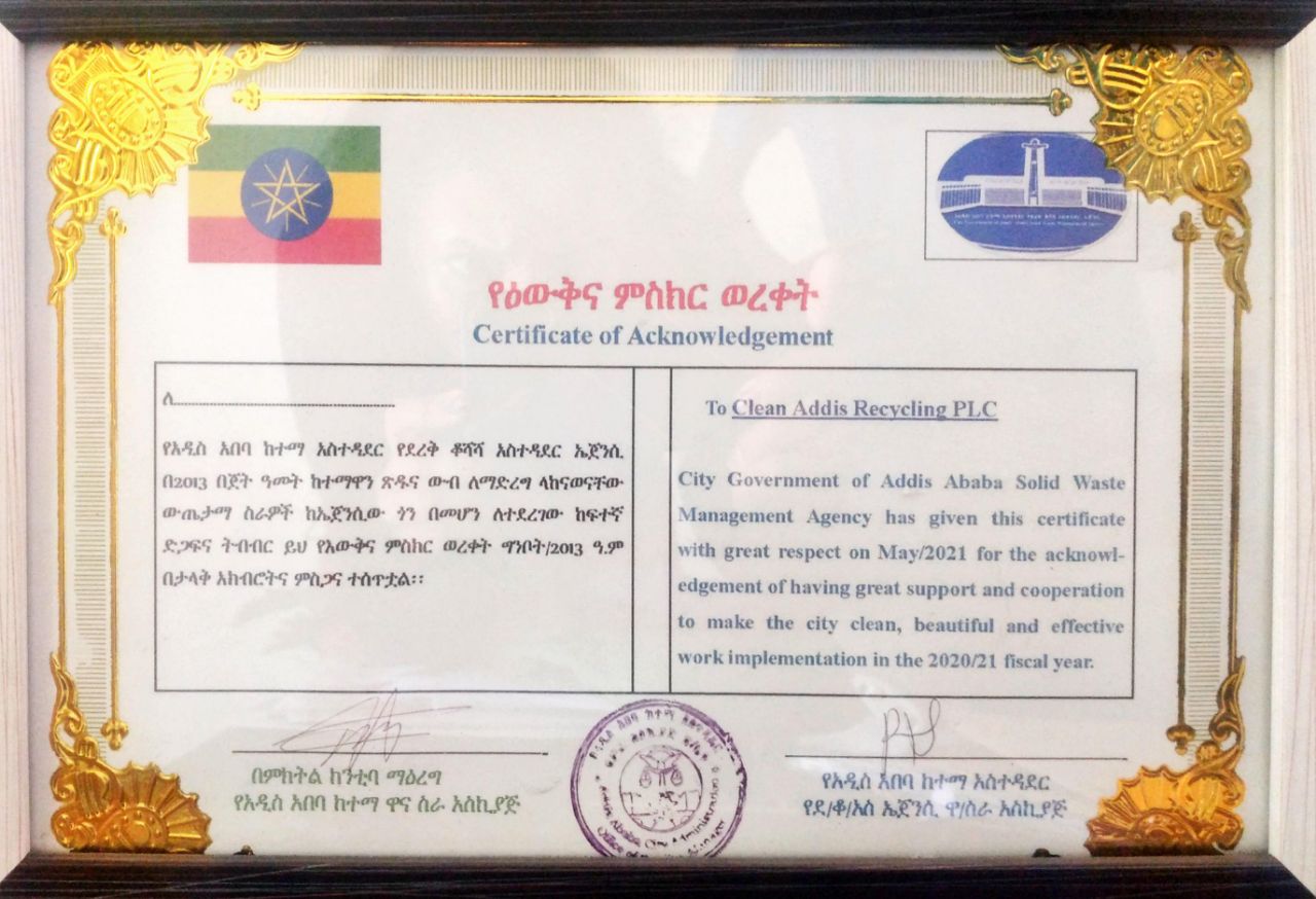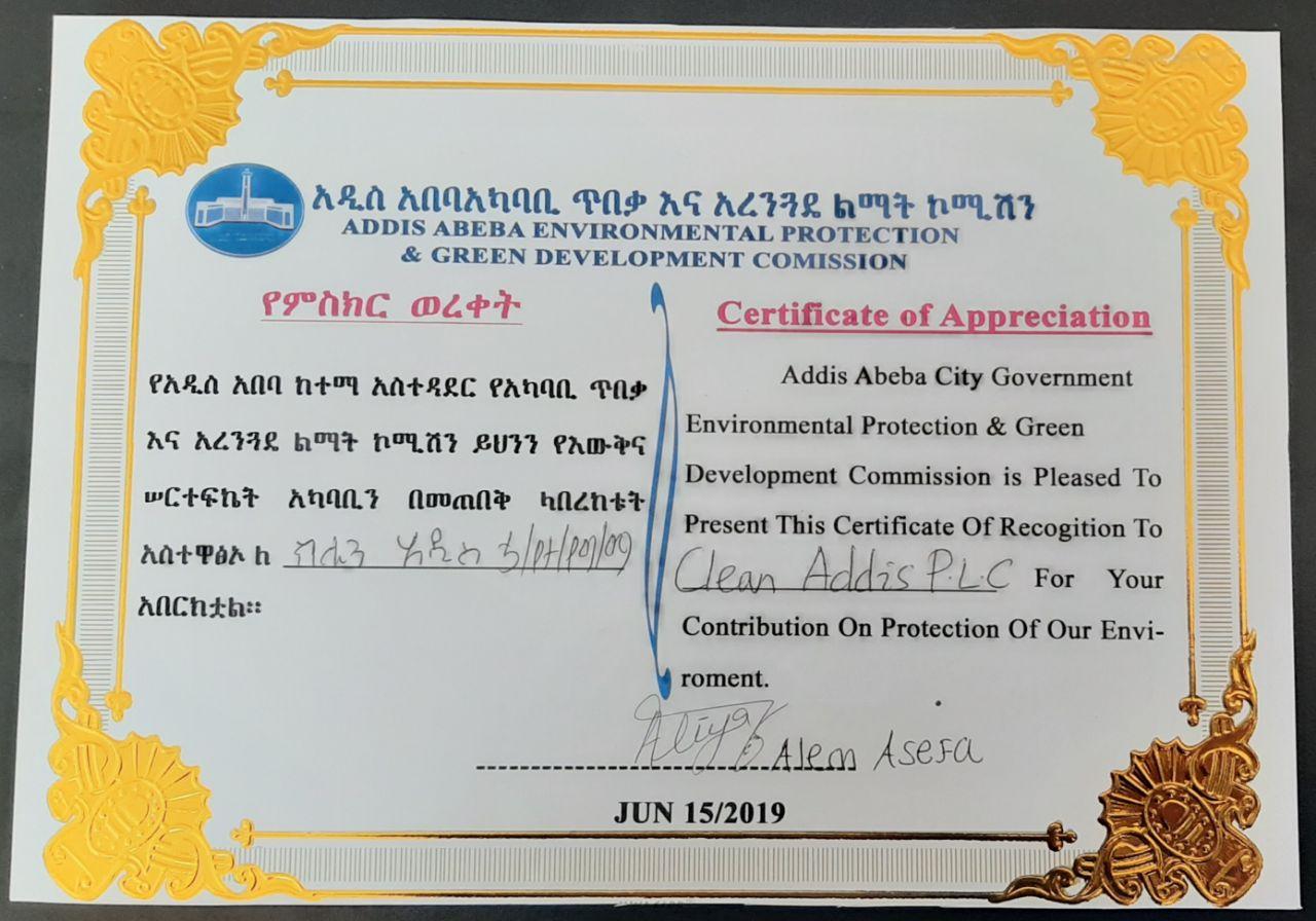Besides generating revenue from waste products, the company envisions to re-create Addis Ababa as green and habitable city free from harmful pollutants. The efforts we put in recycling waste products (which otherwise would have gone to landfill) is the fight we are putting against global warming. In recognition to our contributions so far, we have received a certificate of appreciation from Addis Ababa Environmental Protection and Green Development Commission in June 2019. Although this recognition was an achievement by itself, our real motivation comes from our commitment to protect the environment and fight global warming. We are also engaged in creating public awareness activities with the purpose of mobilising the society in the fight against global warming.